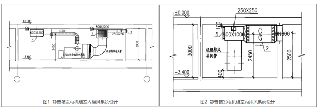 (2)戶外組裝一般依靠當然空氣流通,但本來用以戶外的機型因為多種要素務必擺放與機房內時,其排風系統的要求對比一般房間內型號更嚴格。圖1和圖2是120KW靜音廂式發電機組自然通風安裝示意圖,一般不建議超出120KW的帶廂式罩殼發電機組放在室內。