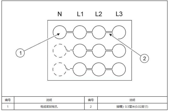 獨(dú)芯負(fù)荷電纜線務(wù)必越過(guò)下圖中所示的孔或電纜密封接頭槽口。電纜密封板需要由非鐵制材料制作。