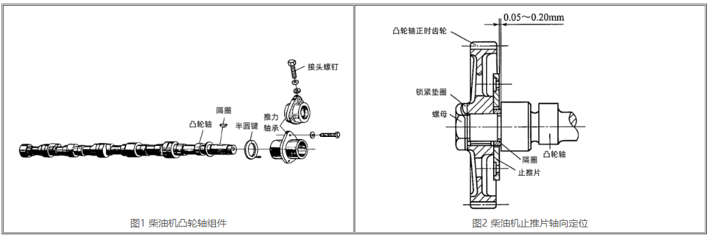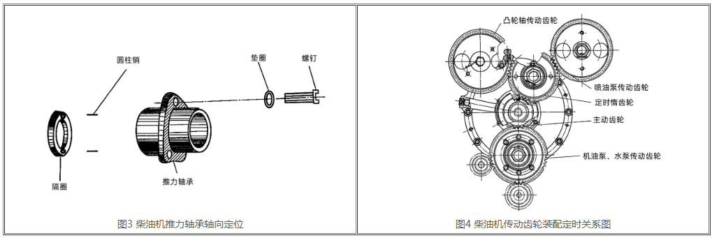 如下圖2所顯示,曲軸止推片用螺釘固定在氣缸套上,止推片與正時(shí)齒輪之間應(yīng)留出適度間隙,此間隙的尺寸一般為0.05~0.20mm,做為零件受熱膨脹時(shí)余地。此間隙的尺寸可通過(guò)更換隔圈來(lái)調(diào)節(jié)。